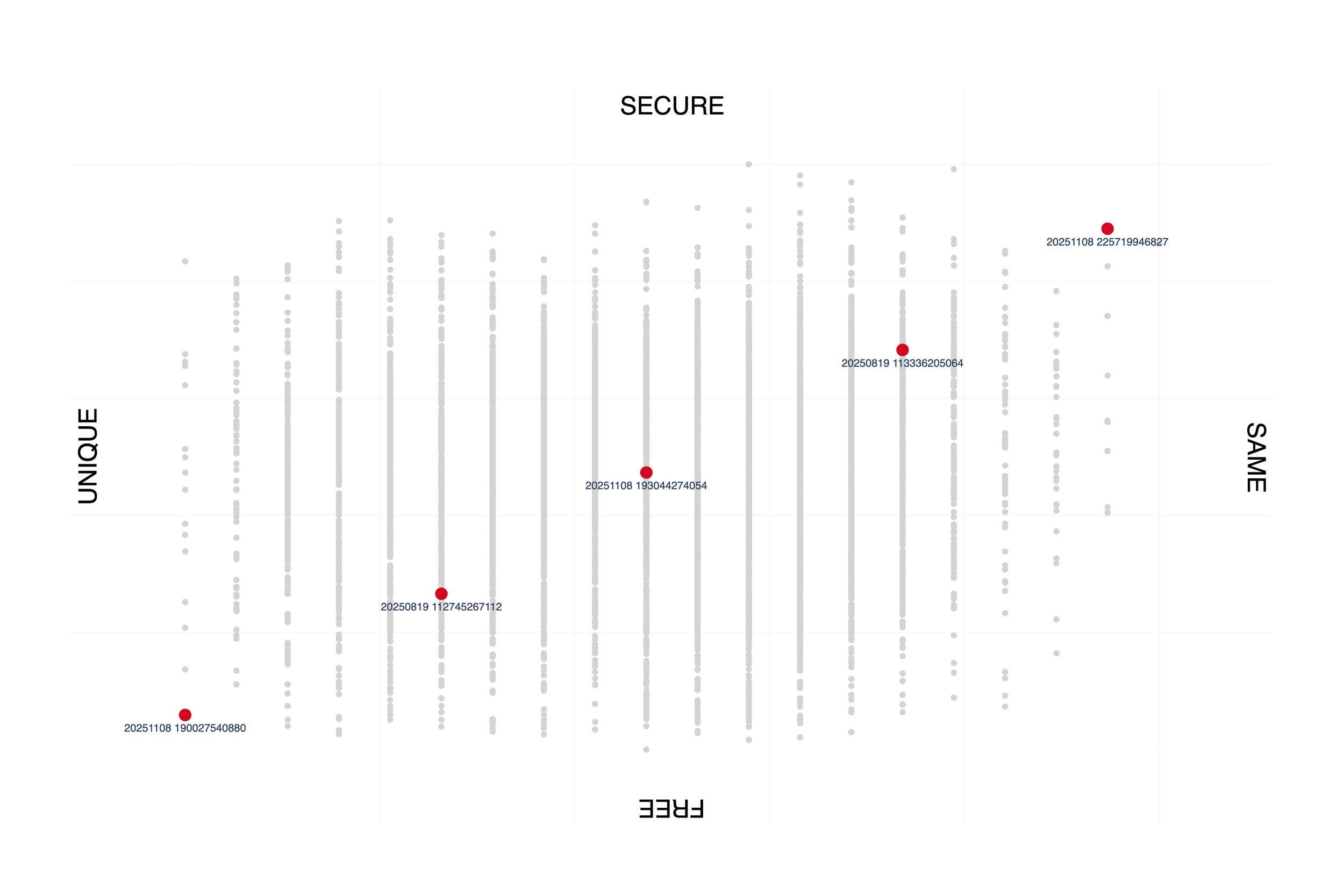 So I developed a grading system. Each quilt is given two scores: one for how similar they are to the original quilt, the other for how “secure” or “free” the viewer perceives their positive space to be.